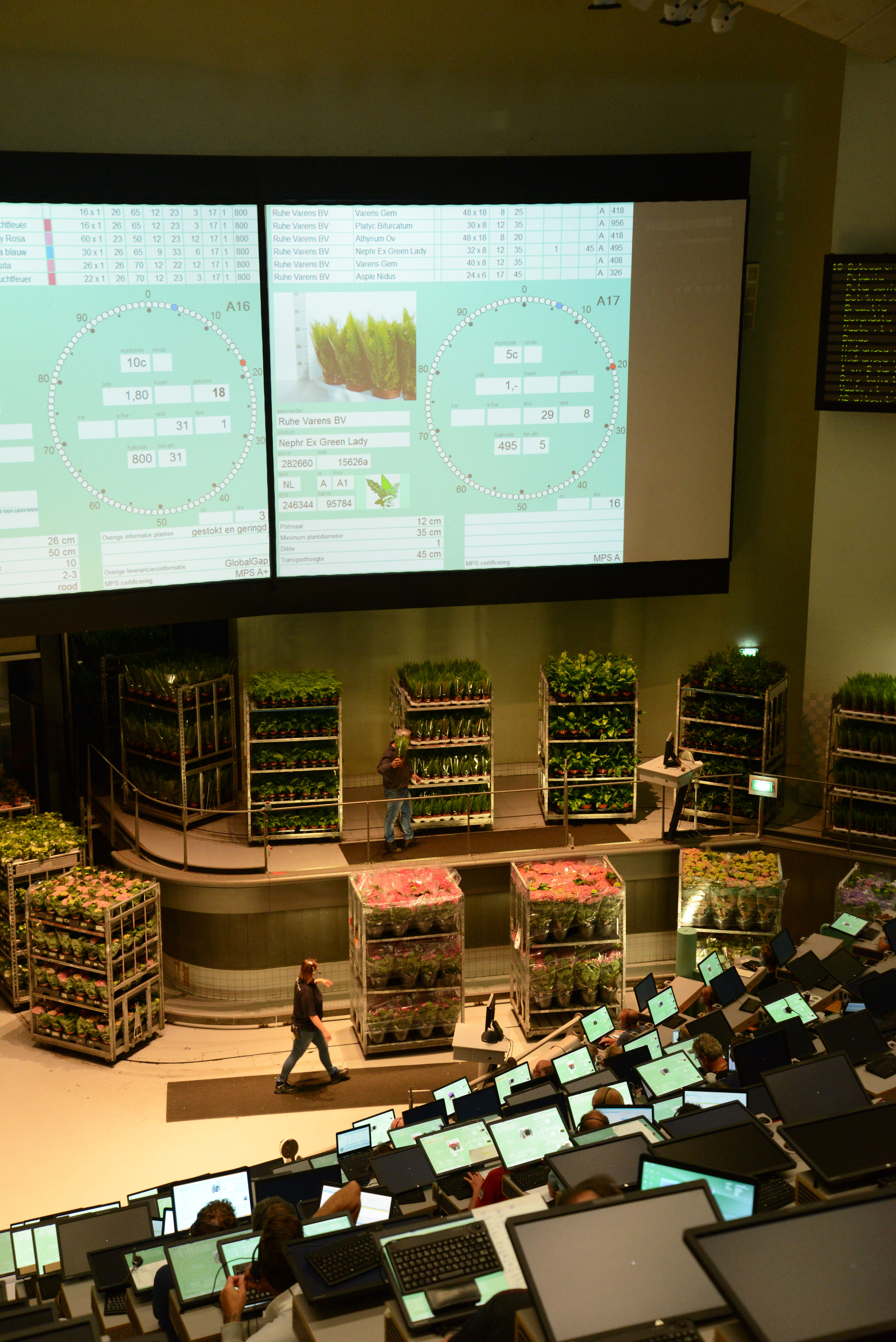 On the video boards, buyers watch a round circle, often referred to as the clock. Think of it as a giant hollow ring with a ball inside that falls counter clockwise. Buyers follow the Dutch auction system, where the price is set high by the auctioneer and then the ball drops, stopping as soon as a buyer is willing to pay the given price. Each auction offer only takes a few seconds. At full capacity 32 clocks and 60 auctioneers can complete 1,500 transactions per hour per clock.