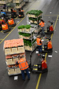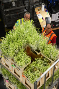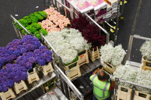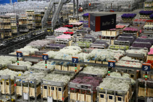The inside of the vast refrigerated complex is a beehive of activity. Speed is everything when dealing with fresh, but fragile flowers and plants. Orange-colored electric moped-like vehicles move in all directions, pulling a train of flower-filled carts of various lengths. No one appears to be directing traffic. For this untrained observer it reminds me of a chaotic maze of vehicles trying to escape the chaos before Godzilla destroys the city. In reality, a sophisticated computerized barcode system is used to fill orders and instruct the drivers to the correct loading bay for shipping around the world.