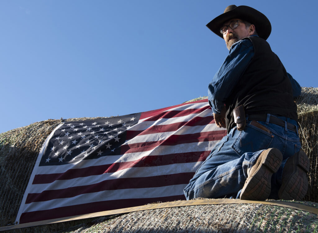 Stan Hazen tightens a load on the back of a trailer he would haul to Nebraska. Ashes to Ashes hay convoy, Englewood, KS to Grand Island, NE, April 27, 2019.