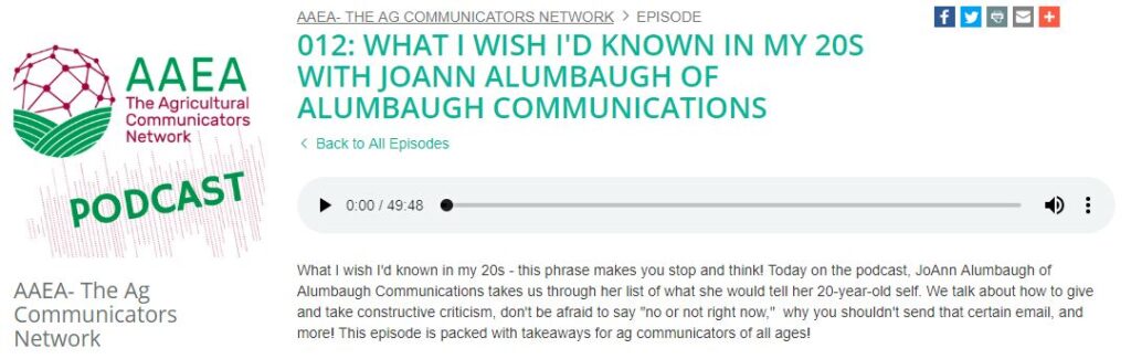Today on the podcast, JoAnn Alumbaugh, president and CEO of Alumbaugh Communications, joins us to share her career advice of what she wishes she would have known in her 20s. We discuss taking and giving constructive criticism, how to say, “no or not right now,” why you shouldn’t send that email, the importance of mentorship, and so. much. more. No matter your age, this is great episode for ag communicators in all stages of their career.