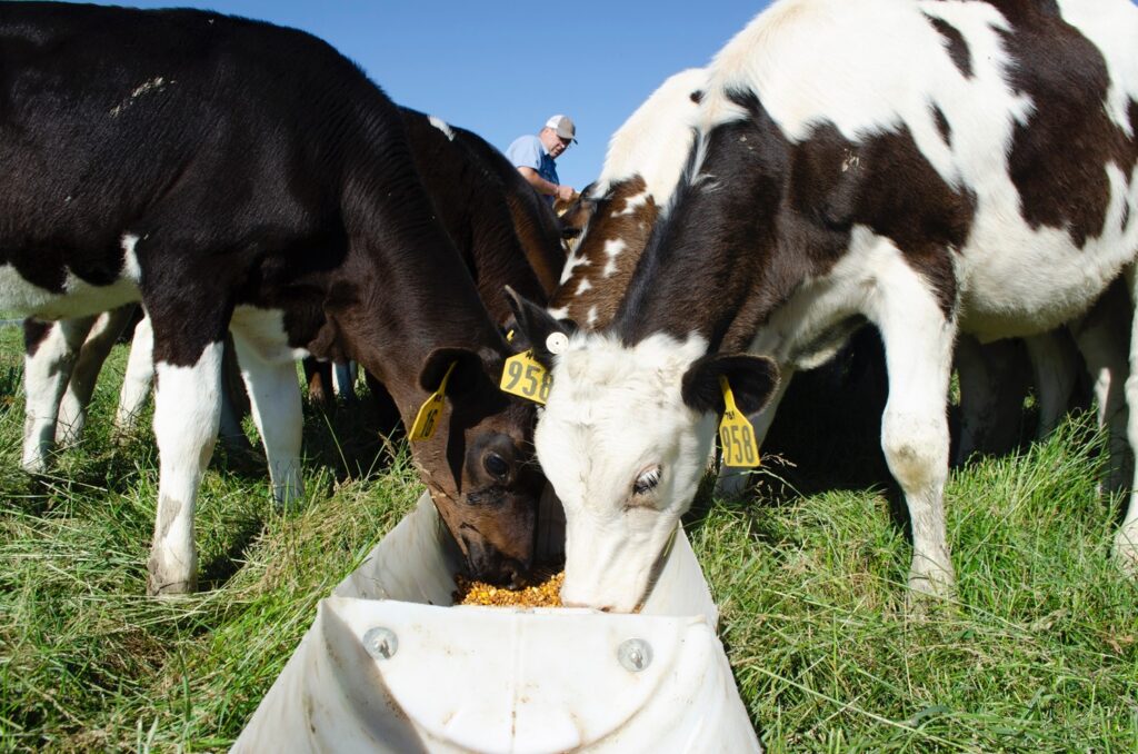 We loaded up in dairyman Tom Cook’s Gator and headed up the hill to the weaned calf pens. Several great opportunities presented themselves as the calves chased us up the hill and Tom reorganized the feeding area. He dragged the feeders onto a new swath of the pasture for the day, and I sat myself at the East end of the bunk and waited with the calves for feed delivery.