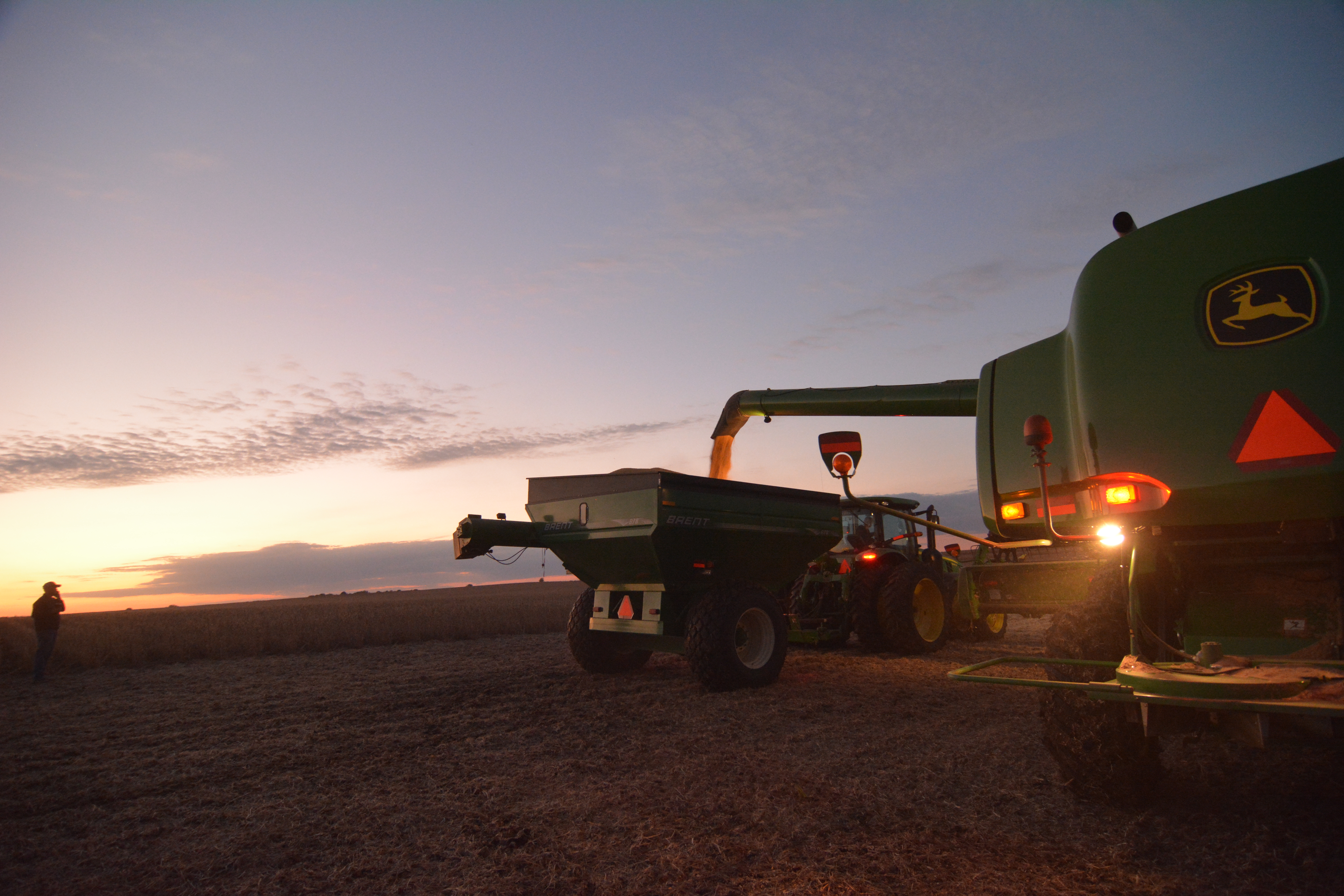 What drew me to this image was the farmer on his cell phone, who appears rather small–but important–in the sunset horizon, given the juxtaposition of the large combine in the foreground dumping a load into the grain cart.